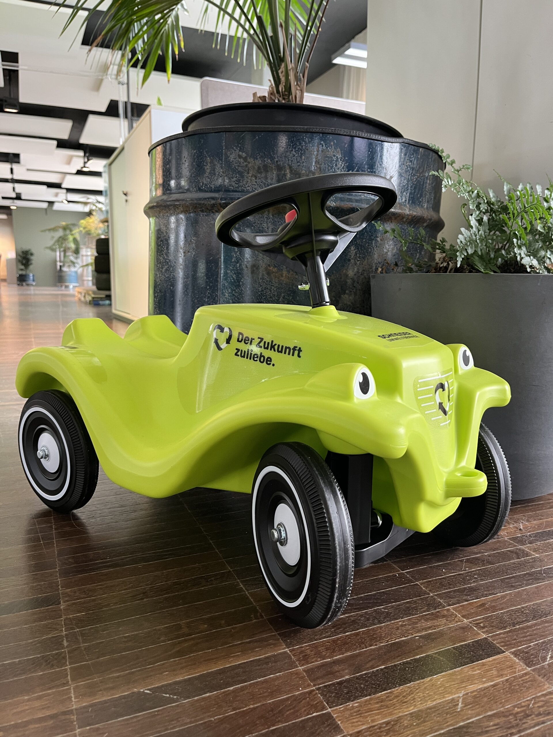 Unser peppiges Bobby Car im Schneidergrün zu den Massen 20 x 58 x 38 cm.